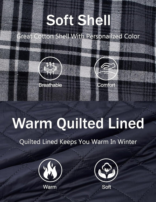 Men'S Quilted Lined Flannel Hoodie Jacket Cotton Button down Shirt Jacket Long Sleeve Plaid Shirt Shacket